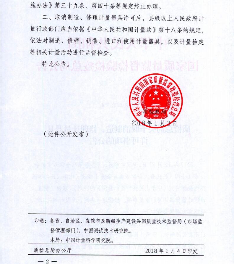 國(guó)家質(zhì)檢總局關(guān)于取消、修理計(jì)量器具許可事項(xiàng)的公告